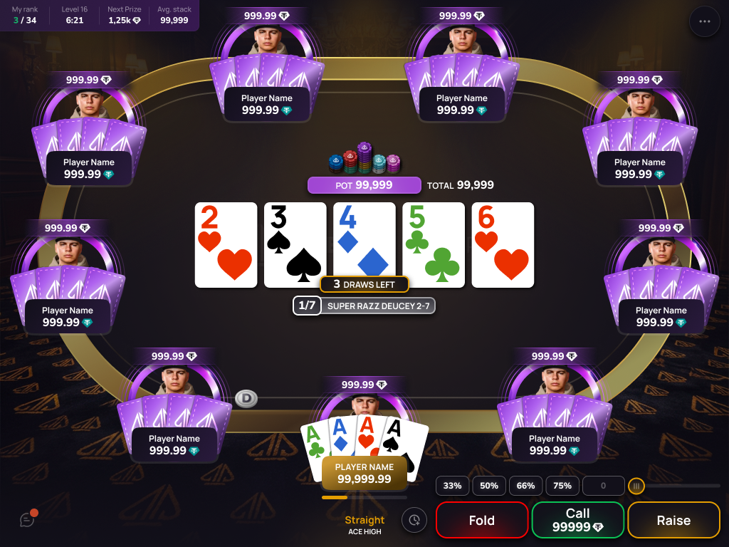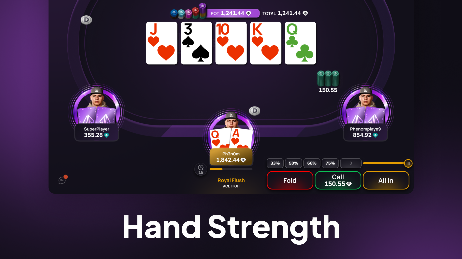 We’ve added each player’s equity percentage (their chance of winning the pot) whenever one or more players are all-in. This gives players real-time insight into their winning probabilities.