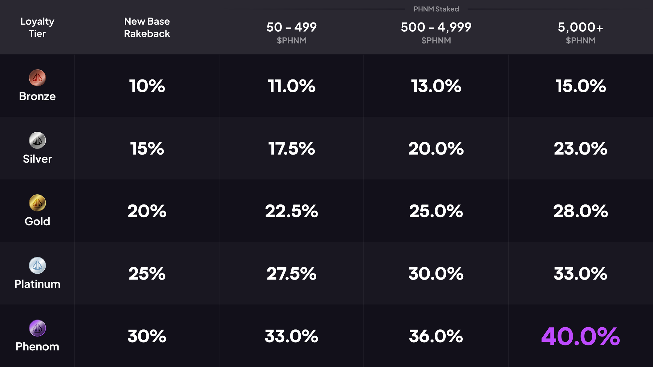 You can still grind your way up the status tiers to earn more rakeback (no requirement to buy $PHNM). But now you also have a new path to jump into new tier immediately by staking $PHNM.
