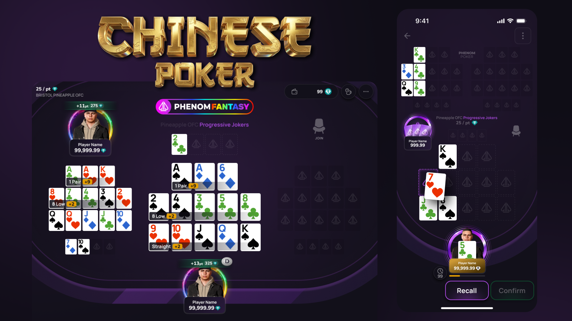 Multiple variants are supported, including Pineapple, 2-7 and Progressive. (Jokers will be added in a future release).